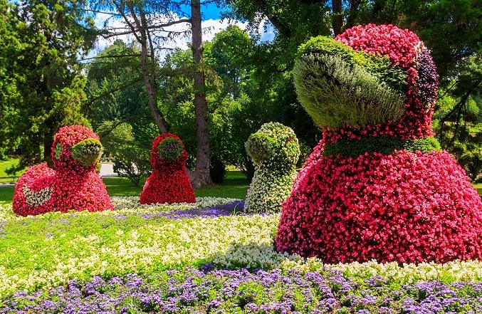島上一年四季都有主題花卉,春天鬱金香綻放形成彩色海洋,夏天千種玫瑰爭相開花,秋天菊花與大麗花染紅島嶼,冬天飄舞的雪花把小島裝扮成白色的童話世界,戶外花雖少,但溫室及蝴蝶館仍可參觀。