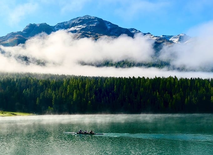 聖莫里茲湖海拔約1700多公尺,是一處集合高山與度假小鎮的高山湖泊,空氣乾燥、陽光充足且閃耀如香檳氣泡,因而有「香檳氣候」之稱,這裡空氣清新,呼吸都像在啜飲香檳呢!夏天來可見湖面上點綴著風帆船及獨木舟,冬天湖面冰封則會舉辦冰上賽馬與雪地競技活動。