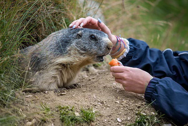 在薩斯斐餵食土撥鼠是最療癒也是最受歡迎的行程,是這座小鎮的金字招牌。土撥鼠活躍的季節約在每年4月中下旬至9月中旬間,這段期間可近距離餵食土撥鼠,最佳食物是切成條狀的胡蘿蔔,看著土撥鼠圓滾滾的身材和俏皮的大門牙,搶食的可愛模樣是旅程中的一大亮點呢!