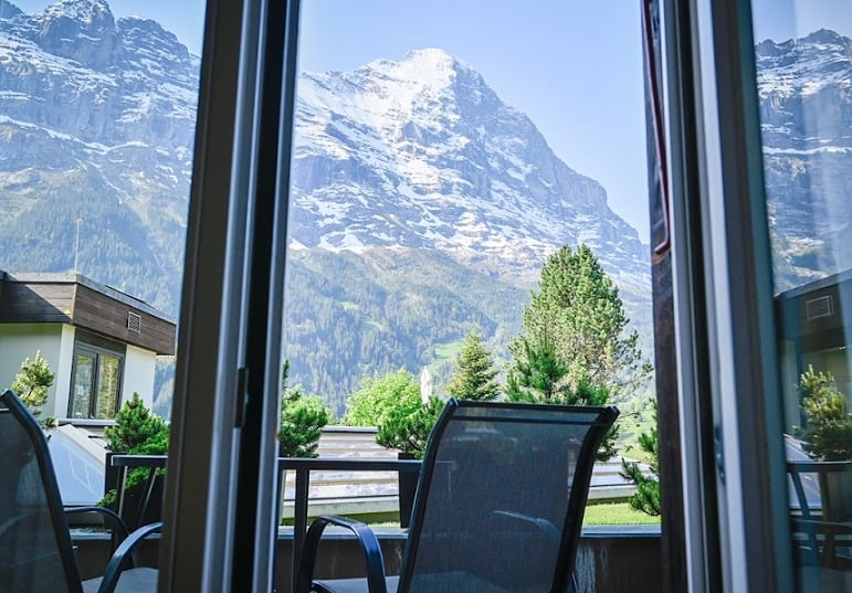 安排的是面艾格峰的房型,不是遠眺而是平視,不是風景而是一整面山壁帶來的震懾,那黑褐色的岩石紋理清晰在眼前,彷彿伸手就能觸摸,坐在陽台眼望這壯麗的美景,真是人生的一大享受。