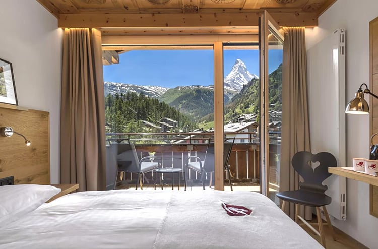 面景房擁有絕佳視角遠眺馬特洪峰,房內設計典雅,溫潤的木質設備打造出靜謐又自然的氛圍,讓旅客放鬆享受山城度假的美好時光。