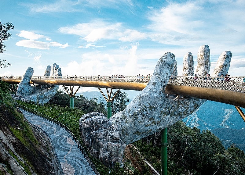 乘坐纜車約20多分鐘,就能從熱帶城市穿過雲海飛向歐洲山城,此處最著名的景點就是「黃金佛手橋」,由兩隻巨大而布滿青苔的佛手捧著金色的橋,特別的造型設計令人驚嘆!此橋於2018年6月開放,總長約150公尺,在橋上能眺望遠山綠林,令人心曠神怡,因聳立於雲霧之上,讓旅客拍照時雲霧繚繞,像身在仙境之中呢!