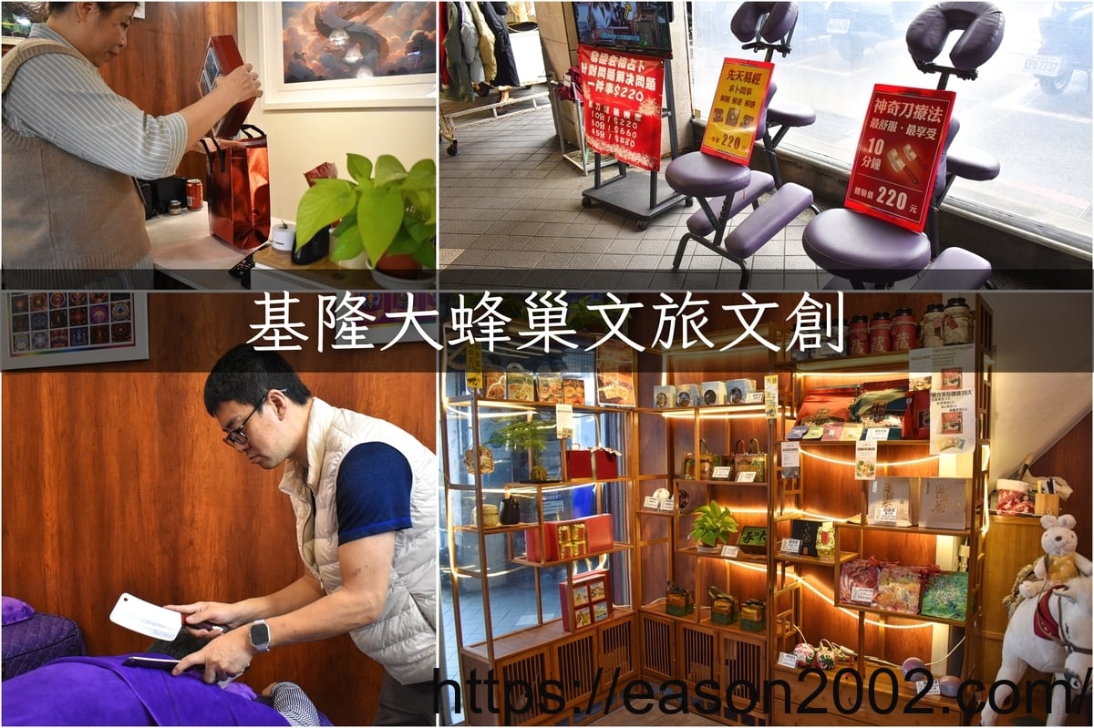 基隆大蜂巢文旅文創 座落於基隆夜市旁、海洋廣場正對面,門口擺放兩個刀療椅,還不難找,搭乘公車、火車都可以抵達,交通方便、地理位置好找,由於正剛好在交通樞鈕的火車站與公車站旁,將基隆大蜂巢文旅文創放置基隆旅遊的最後一站,恰好可以順便將以「基隆美食」、「基隆景點」為主軸的茶葉伴手禮盒帶回家,精緻細膩又具象徵性意義的禮盒,送禮自用皆宜,10分鐘的基隆傳統療癒式刀療,放鬆一下,真的很不錯~!!!