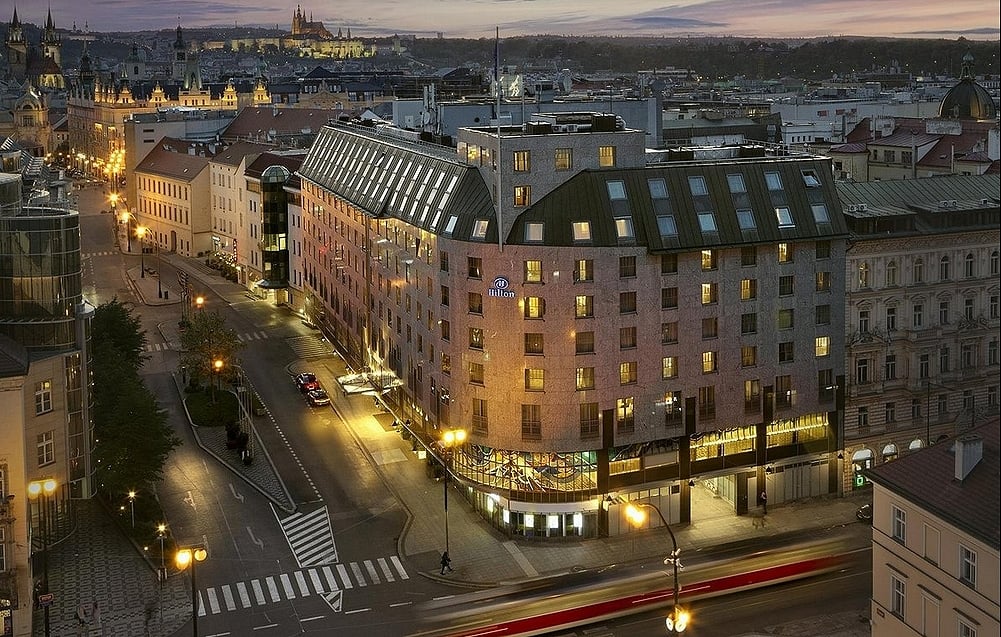 希爾頓飯店以沉穩的石材外牆與歐式屋頂佇立在古城街道旁,與千年古城只有一門之隔,是現代旅館與歷史城市間的優雅過渡,走出大門不到5分鐘,就能站在「火藥塔」前,欣賞夜間打燈下展現的風情。