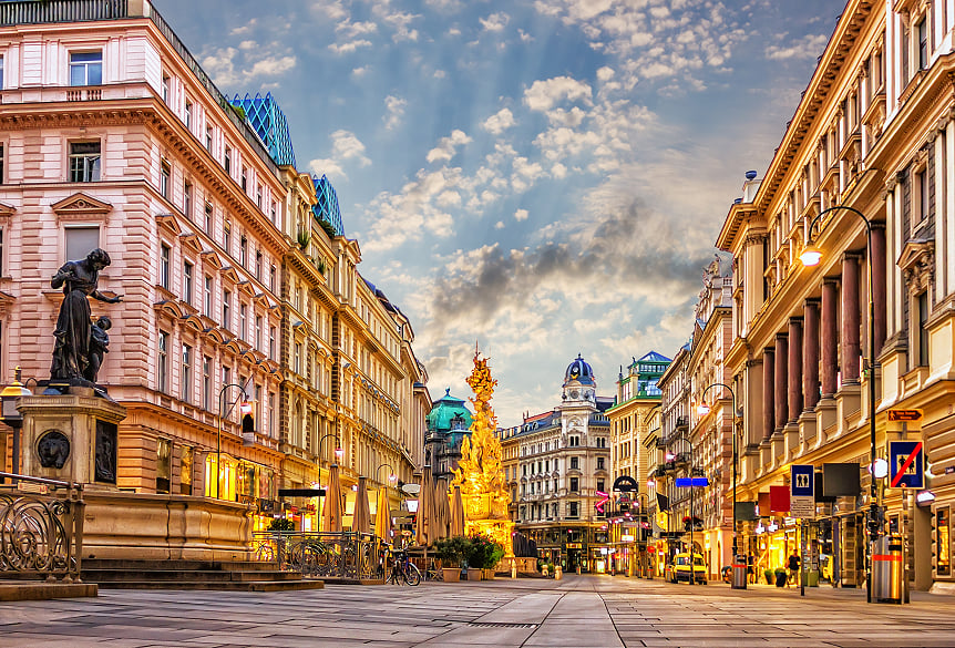 離飯店不遠的「格拉本大街」是維也納著名及繁華的步行街道之一,也是舊城區的重要地標,中世紀此處曾是維也納城牆的護城壕,城市改建後護城壕填平,形成如今的步行街。兩旁保留了巴洛克及文藝復興風格建築,是條充滿歷史、藝術與咖啡文化的購物大道,晚上不妨來逛街購物。