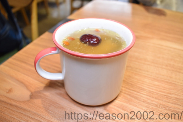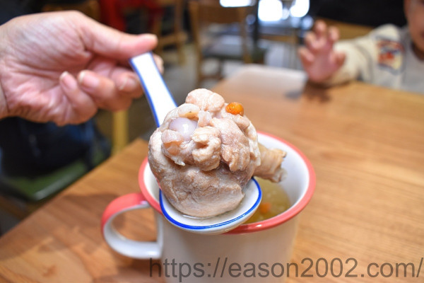 喝起來清甜美味的湯品,使用新鮮椰子與雞肉精心煲熬而成,吃雞肉時可以感受到「秦朝老碗麵中和民德店」的用心,雞肉吃起來帶著湯底的香甜,而且完全不乾柴。