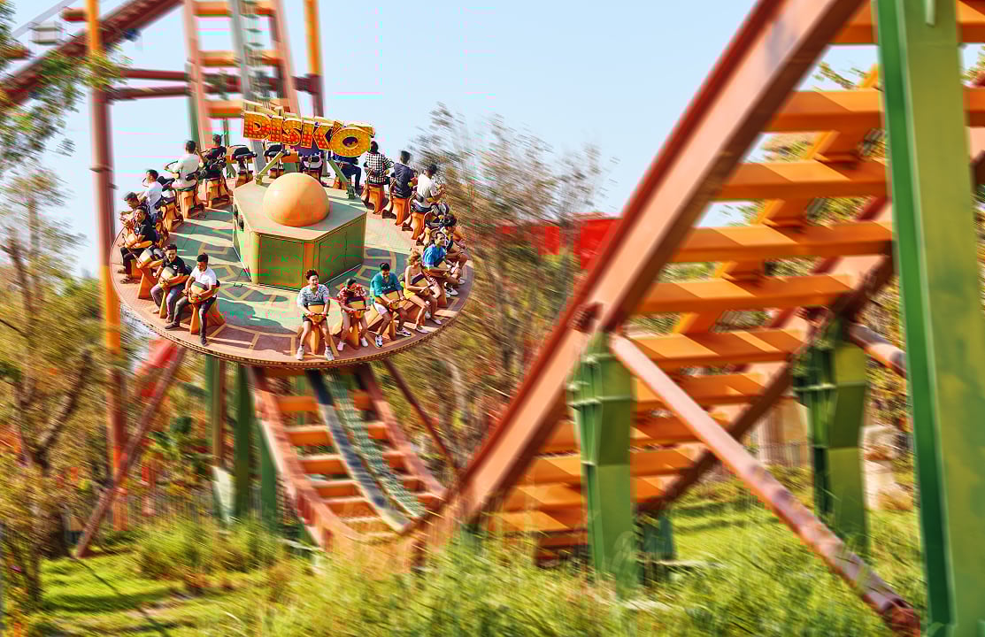 「冒險世界」是非常受歡迎的一區,「迪斯可飛盤」這個設施結合了「旋轉」與「擺盪」雙重刺激,當轉盤衝向軌道最高點時,會有短暫的失重感,配合著旋轉產生的離心力,讓冒險者體驗如同在空中跳舞般的快感。