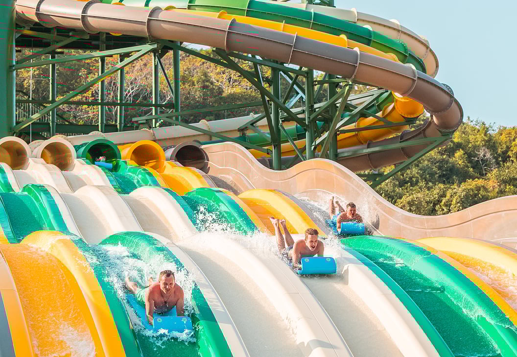 園區的「水上樂園」能享受多種類型的水上設施,最經典的「蛇神滑道」是從頂端俯衝而下,在蜿蜒封閉的滑道中急速轉彎,最後衝入水池中,超級刺激好玩。這裡也有慢節奏的漂漂河及為小朋友設計的多功能水上城堡、迷你滑道與噴水設施,親子同樂一起在水花中歡笑。