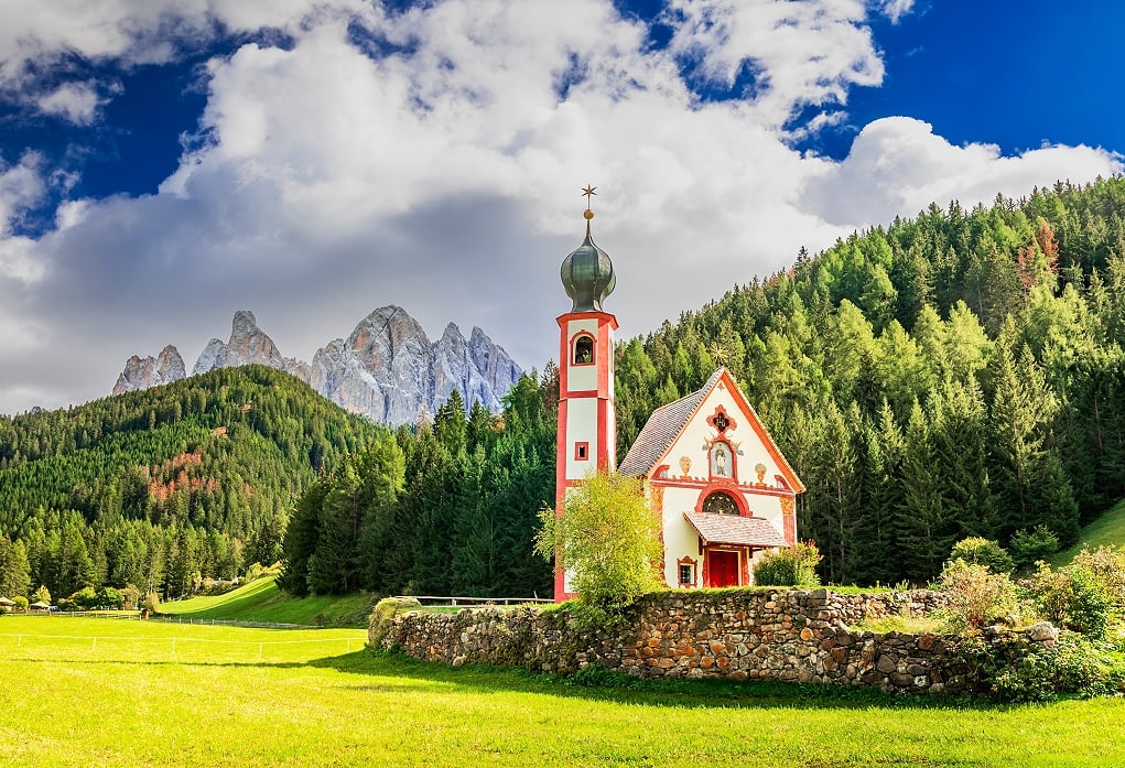 山谷間的「聖約翰教堂」帶有巴洛克元素,外牆細膩的裝飾展現阿爾卑斯山區深厚的宗教與藝術底蘊,在後方灰色山群與綠色森林的襯托下,顯得格外亮眼,雖然微小卻顯得堅定,能帶來心靈的平靜。