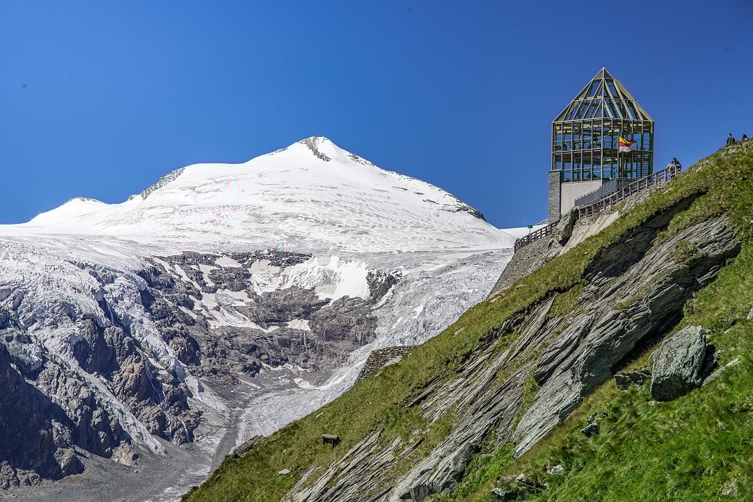 這座造型極具未來感的玻璃建築「威廉斯塔」,位於公路的最高點約2,369公尺的高處,大鍾山近在咫尺氣勢雄偉,也是俯瞰東阿爾卑斯山最長冰川的絕佳角度。當陽光透過玻璃塔灑入室內,光影會隨著大鐘山的雲霧變化而流動,如夢似幻讓人像是身臨其境。