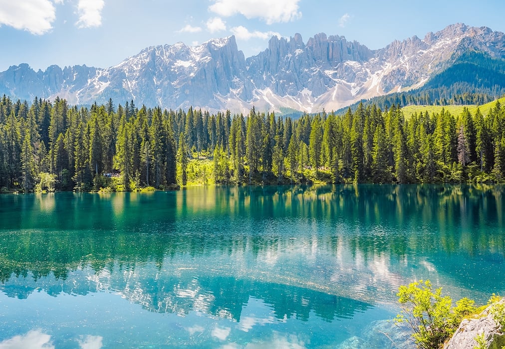 清晨是布萊埃斯湖最美的時刻,此時湖面沒有波瀾,能把群山與天空完整收藏在湖水之中。湖水呈現一種極其純淨的碧綠色,這種色彩源自於湖水的深度,以及周圍白雲石山脈礦物質的反射,因而能在陽光照射下,閃耀出像寶石般的光澤。