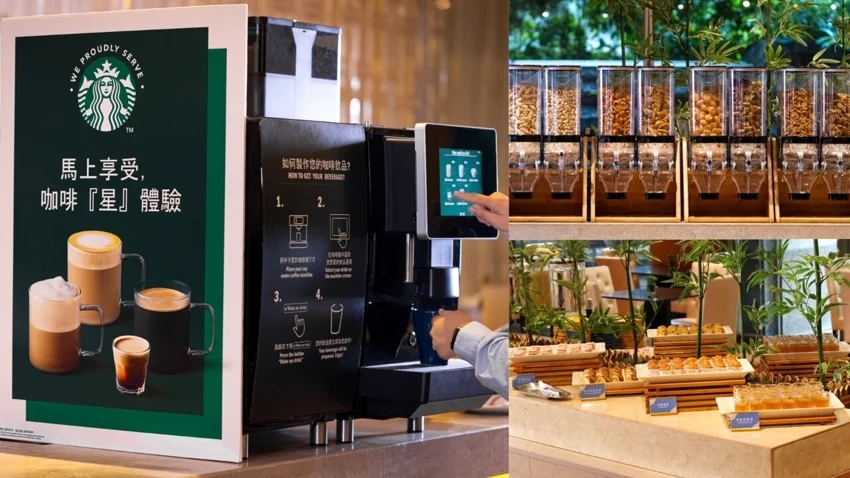 進去的第一件事,就是被星巴克咖啡機吸引住腳步——可以無限暢飲。喜歡喝咖啡的人光是這一點就值回票價了。除了星巴克,還有義豐古早味冬瓜茶、黑面蔡楊桃汁、大苑子蜜桃蘋果汁等台灣人氣飲品,不喝咖啡也有很多選擇。