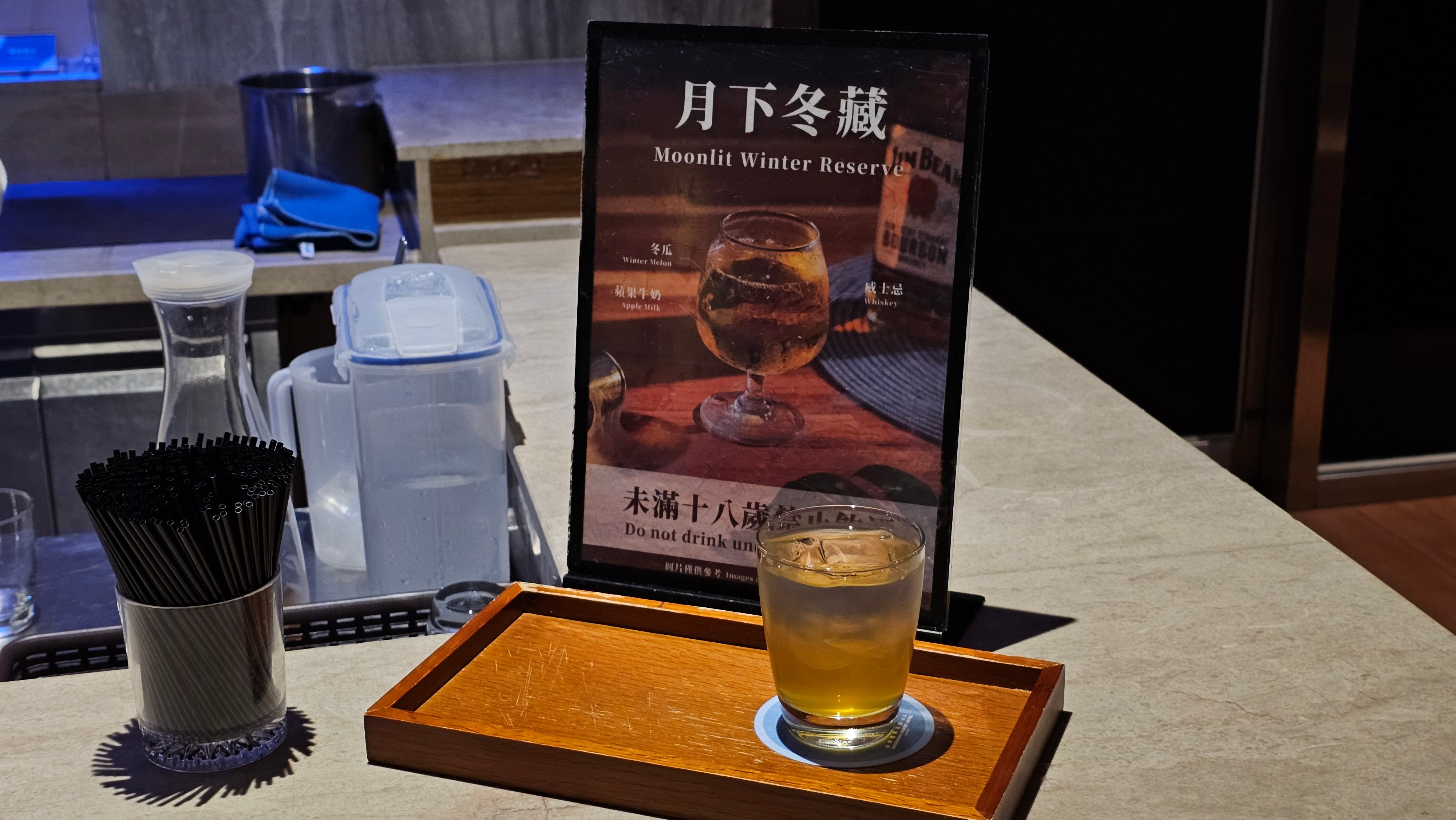 主角是由榮獲 2025 裸鑽雪莉調酒大賽台灣冠軍調酒師「秋葵 Okra」精心調製的「鳳凰特調」。夜間特調會隨月份變化,這次喝到的是月下冬藏,它的口感——酒味不重,甜中帶點冬瓜茶香,連平常不太喝酒的人喝完也說好喝。