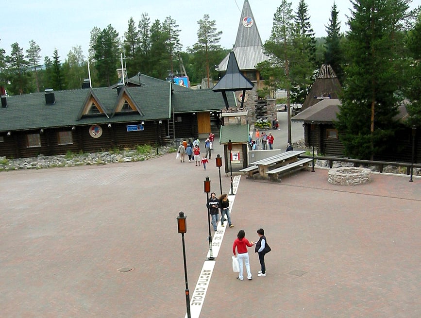 村內地上畫有真實的地理界線—「北極圈北緯66.5度」,周圍有指示牌與紀念標誌,很多旅客雙腳張開橫跨在此線,象徵進入極地世界,是一條很有紀念性及儀式感的標線。