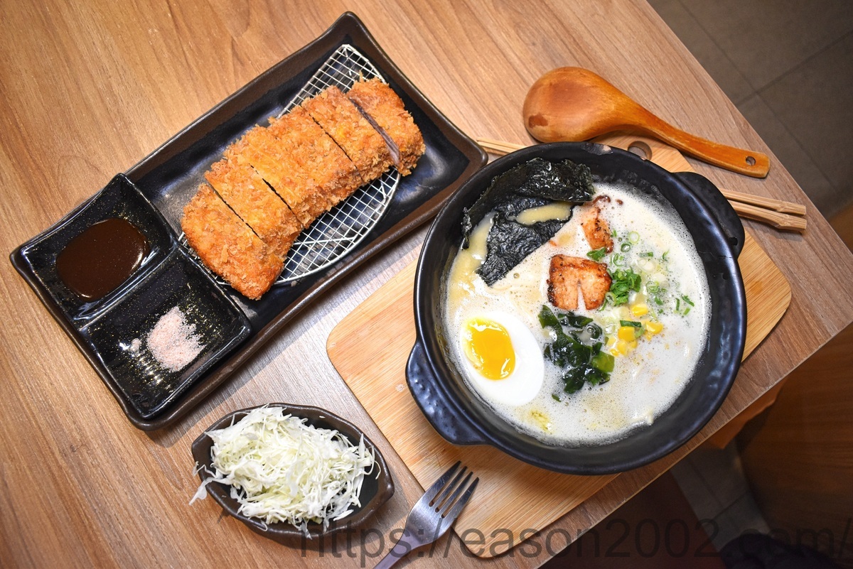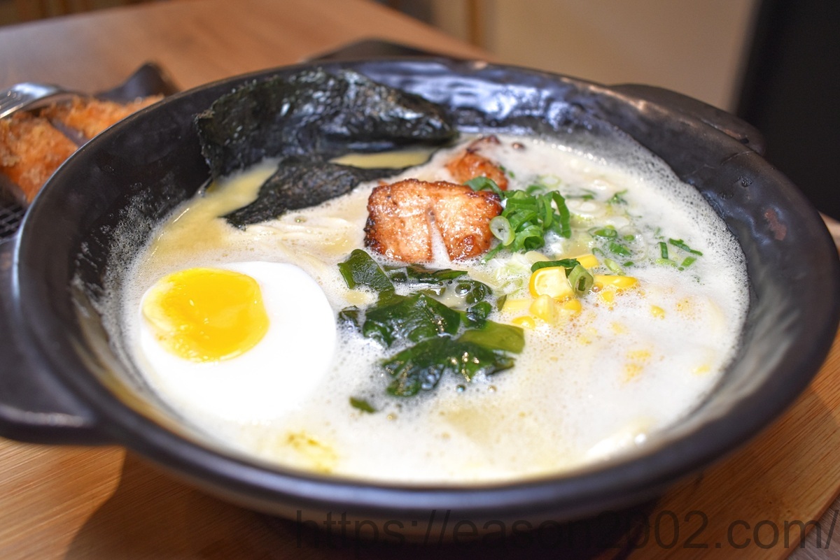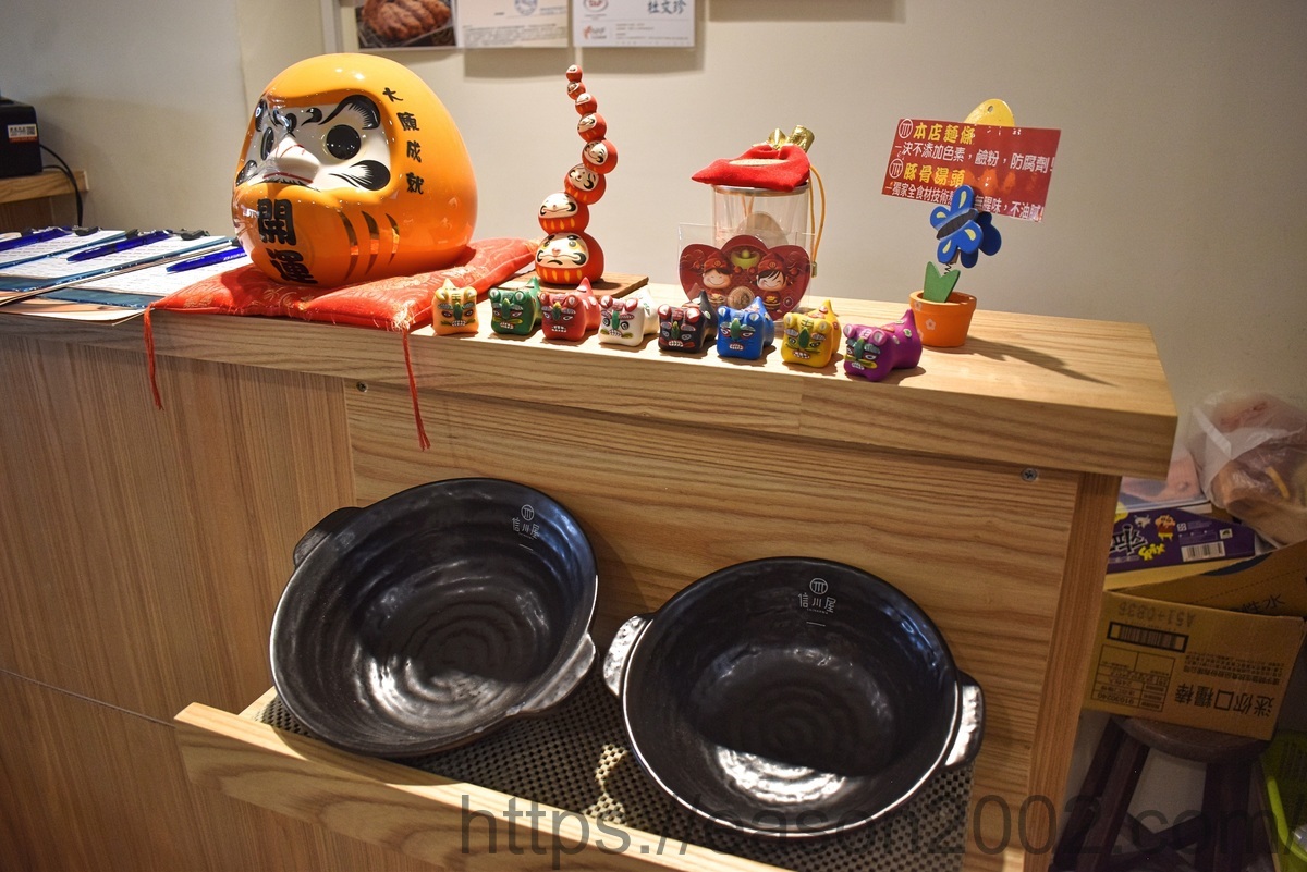 台中拉麵店「川信屋」砂鍋手工拉麵分 迷你碗/S、標準碗/L,櫃檯下方有砂鍋大小sample,可以依個人食量斟酌選擇,我們今天點一碗「博多雞白湯拉麵(唐揚雞)迷你碗/S」與「黃金豚勝」,感受手工拉麵的Q彈有勁、醇郁的豚骨湯頭。