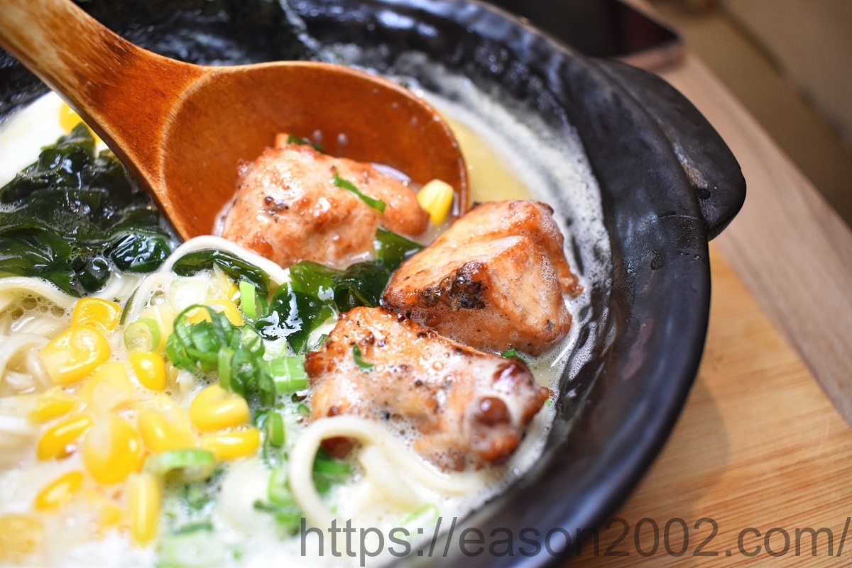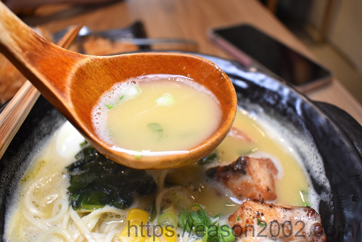 (砂鍋碗小心燙手)除手工拉麵的Q彈帶勁,湯底更是一絕,以 豚骨湯頭 為底,再加入精心熬製的雞白湯底,湯色呈金黃色,濃、醇、厚,且不油膩,完全不偷工減料,喝完後的口齒留香,讓人戀戀不忘;唐揚炸雞是自家手工醃製,口味有點偏台灣鹹酥雞風味,搭配博多雞白湯拉麵,吃起來完全不膩口。