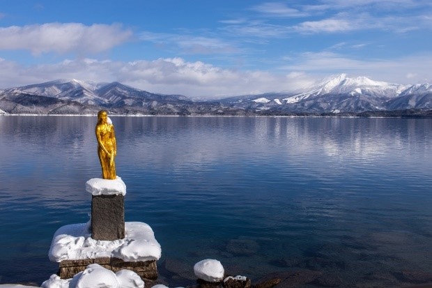 田澤湖 「田澤湖」水深約423.4米,是日本最深的湖,因其美麗的藍色湖泊而聞名。湖的四周被大樹和連綿山脈所包圍,更是日本風景名勝百選之一。景色會因不同季節而轉變,不妨到此一覽美得令人屏息的風景。
