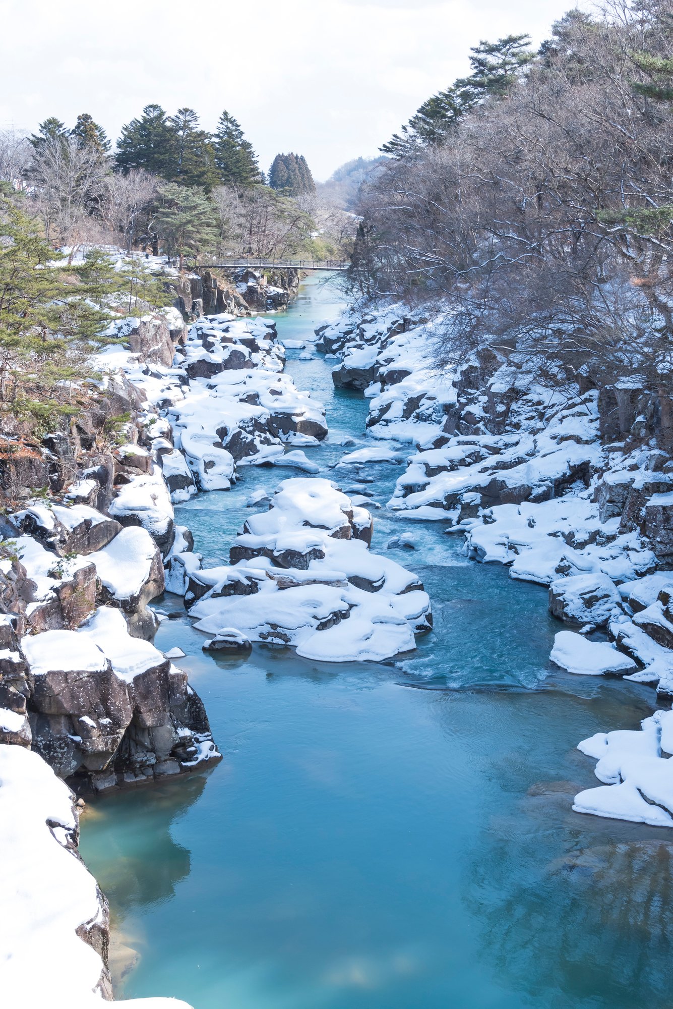 有著日本第一美溪之稱的「嚴美溪」位於岩手縣一關市,是當地的熱門旅遊景點。嚴美溪是磐井川的溪谷,水源來自栗駒山,經歷漫長的時間侵蝕形成獨一無二的地形風貌。長達約2公里的溪谷,其大自然的鬼斧神工,令人讚嘆不已。溪谷更被列為「國家指定名勝」和「自然紀念物」之一,不同季節都會吸引各地旅客前來到訪,特別是於冬天被白雪覆蓋的嚴美溪更顯得有層次感,美得令人屏息。