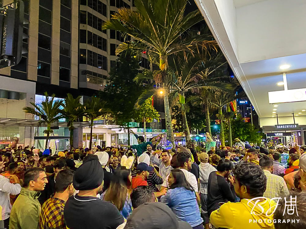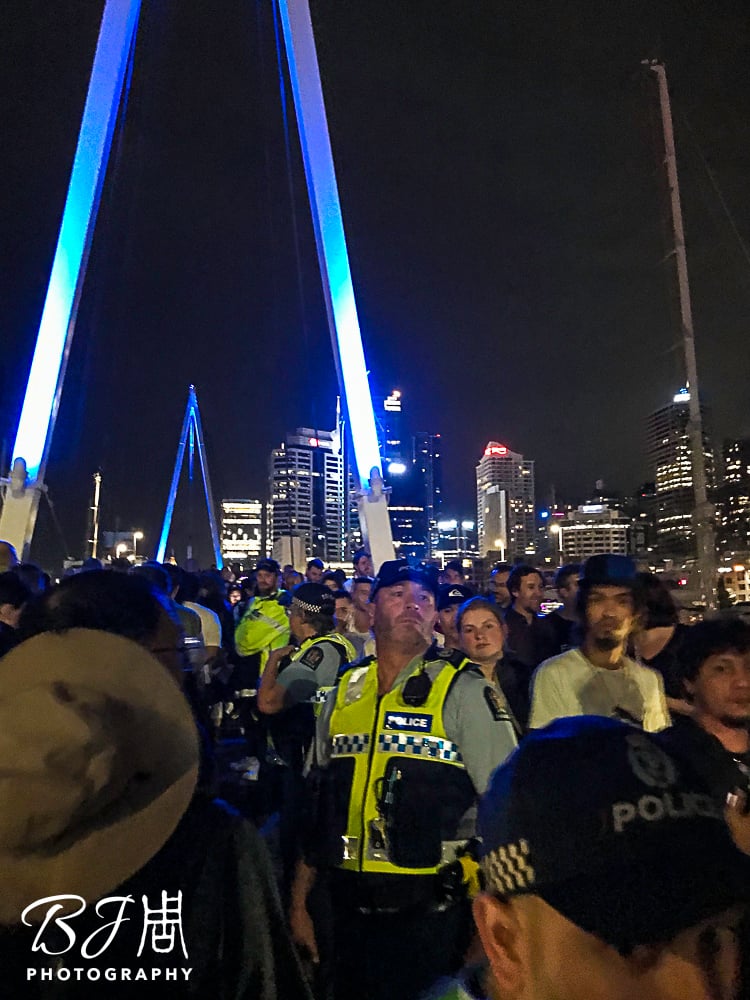 從卡蘭加廣場步行回市中心,走上渡橋到對岸,本來是雙向通行,此時全部湧往出口方向,中央站著一排警察維持行進秩序,停泊港灣的遊艇上還在舉行著派對狂歡,迴盪的音樂和交錯的身影彷彿宣告「歲月匆匆過,人生當盡歡」。